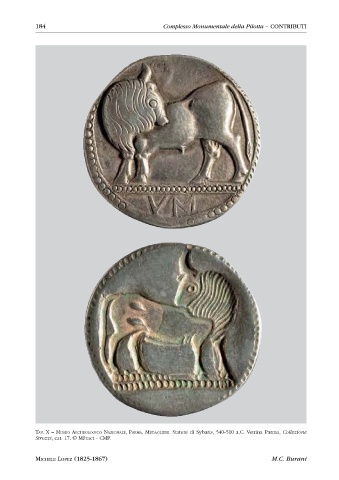 184 Complesso Monumentale della Pilotta – CONTRIBUTI Tav. X – Museo archeoloGico NazioNale, ParMa, MedaGliere. Statere di Sybaris, 540-510 a.C. Vetrina Parma, Collezione Strozzi, cat. 17. © Mibact - CMP. MIChELE LOPEz (1825-1867) M.C. Burani