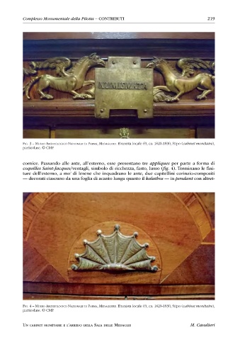 cornice. Passando alle ante, all’esterno, esse presentano tre appliques per parte a forma di