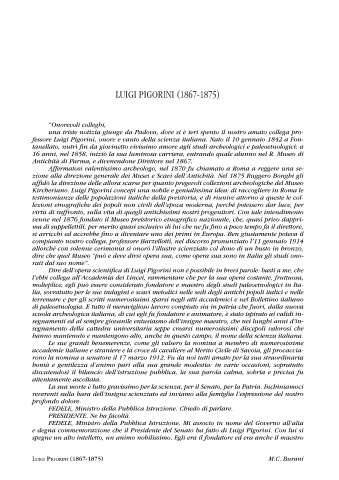 fessore Luigi Pigorini, onore e vanto della scienza italiana. Nato il 10 gennaio 1842 a Fon-