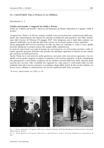 Fig. 1 – Benito Mussolini il 16 agosto 1928 riceve a Roma il ministro di Persia Abdolhossein Teymourtash. È presente