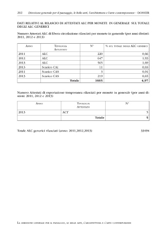 DATI RELATIVI AL RILASCIO DI ATTESTATI ALC PER MONETE IN GENERALE SUL TOTALE
